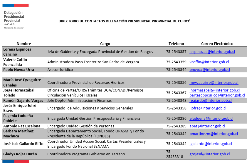 Delegación Presidencial Provincial de La Delegación Provincial de Curicó, se ubica en el Edificio Servicios Públicos, en la Calle Carmen #560, 4° Piso, Curicó. El correo electrónico de la oficina de partes es: partesdppcurico@interior.gob.cl Los horarios de atención a público son de: 08:30 a 14:00 horas.